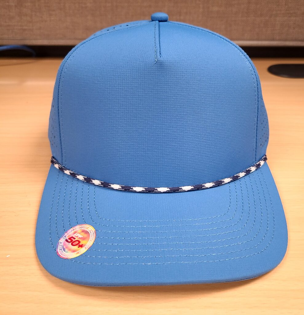 This Five-Panel Performance Cap with contrasting rope detail on the visor comes in Carolina Blue, which leans toward cerulean but is softer and more universal. The UPF 50+ fabric shields wearers from the sun, and the back panels have laser-etched holes to give it an updated look and allow ventilation for added comfort.