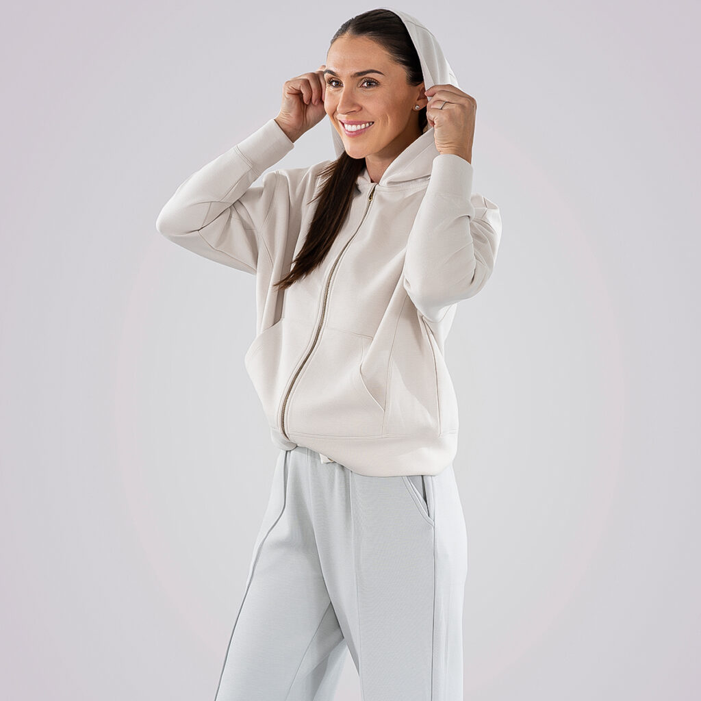 Crafted of a rayon-spandex blend incorporating 13 recycled plastic bottles, the full-zip Allure Hoodie is designed for all-day layering with a fresh, feminine silhouette. (Also available in a men’s half-zip style.) Crafted of a buttery-smooth, mid-weight rayon-spandex blend, it delivers a perfect balance of structure and comfort with a soft, premium hand feel.