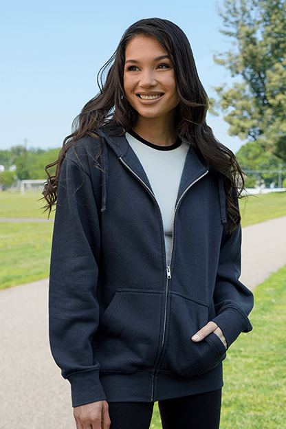 This Ultra Soft Full Zip Fleece is a baggy garment you can wear year-round as a perfect on-the-go layer. The super-soft fleece, made primarily of cotton, features a kangaroo pocket and a flat drawcord hoodie. It comes in black, gray heather and navy and sizes XS-5XL – and for an extra-baggy fit, try sizing up. This could be a fun item for creative decoration placement, with plenty of space to do a chest, sleeve or back design.