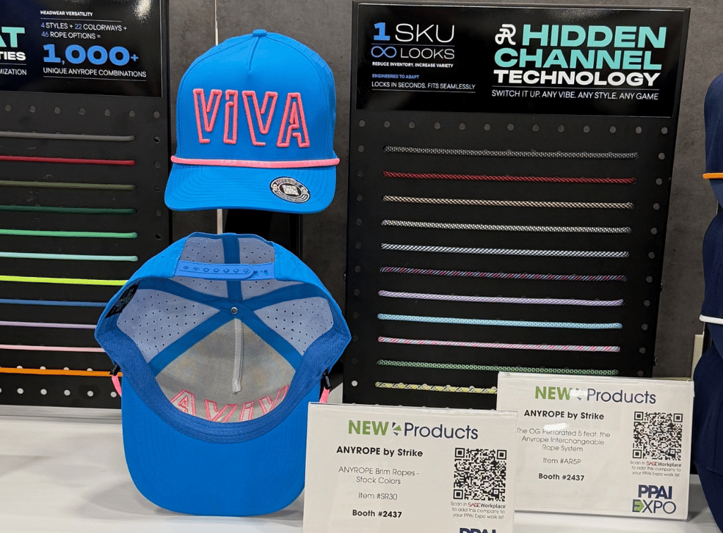 Of all the headwear suppliers at The PPAI Expo 2026, ANYROPE by Strike, which offers 500 stock hat and rope combinations, stood out to Brandon Kennedy, CEO of California-based distributor BrandCo Marketing. “The ANYROPE customization will allow for users who want that extra level of branding to really customize their hats,” Kennedy says. “And for those of us who aren’t exactly fans of the ropes, it’s removeable, which is a nice option to provide.”