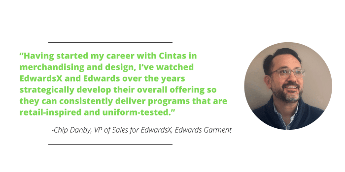 “EdwardsX is a hidden gem,” Danby says. “The variety of apparel needs we can meet is unparalleled when combined with the power of Edwards’ stock apparel offerings. Having started my career with Cintas in merchandising and design, I’ve watched EdwardsX and Edwards over the years strategically develop their overall offering so they can consistently deliver programs that are retail-inspired and uniform-tested.”