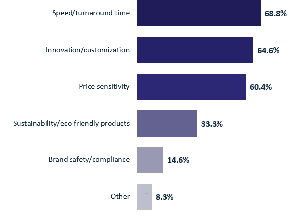 - 68.8% of PPAI 100 distributors say end buyers are prioritizing faster turnaround and rush delivery. It is worth noting that tariff threats have loomed over 2025, putting a perceived urgency on orders from customers all the way down the supply chain. “Promo is increasingly expected to match e-commerce service levels,” Bhat says.