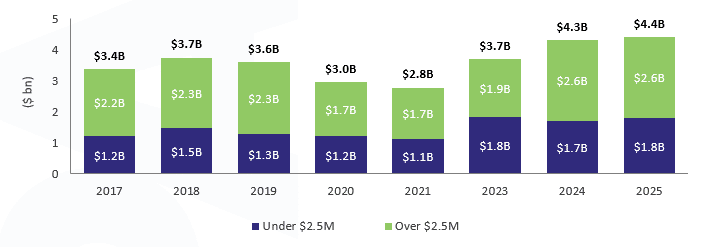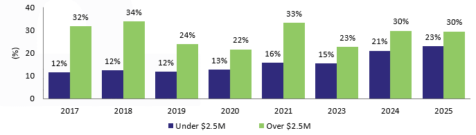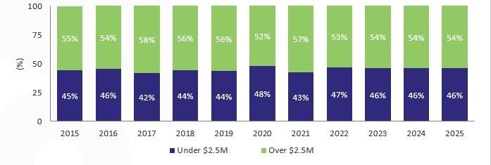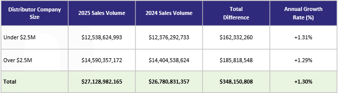 Large U.S. distributors – classified as those with annual sales over $2.5 million – were responsible for 54% of the industry’s sales volume (See Figure below). These distributors generated $14.6 billion in 2025. Conversely, small distributors (under $2.5 million) accounted for 46% of the industry’s sales volumes, making just over $12.5 billion.