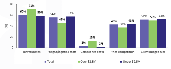 To Bhat’s point, cost volatility absorbed much of the topline growth. Many distributors reported revenue growth without corresponding profit gains. Within that dynamic is a sort of eye-of-the-beholder perspective: When it comes to the state of the promotional products industry, demand was not a significant challenge, but protecting margins was. The chart below indicates that tariffs, freight/logistics costs and client budget cuts are all playing major roles in distributor margins.