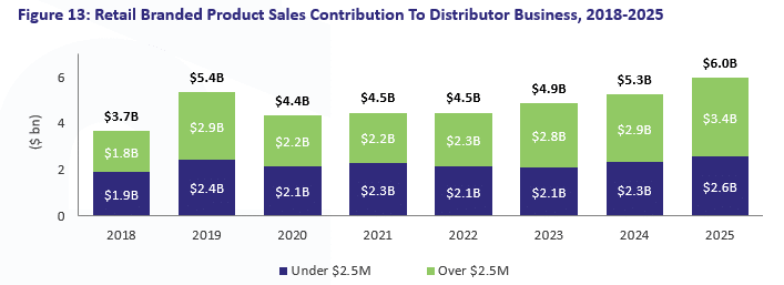 One of the most clear and apparent growth signals in the data is the move toward retail branded products, reflecting a shift toward higher-value items, even if it means sacrificing quantity. In fact, growth in this sector far outpaced industry growth overall, led mostly by large distributors whose retail-branded sales grew by 15.9% (compared to 10.3% among distributors under $2.5M).