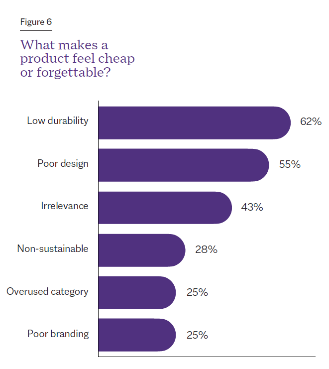 That’s why it’s no surprise that low durability, poor design and irrelevance are the three leading causes for merch to feel cheap or forgettable, consumers say (see Figure 6).