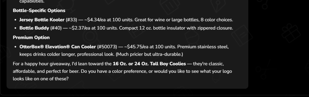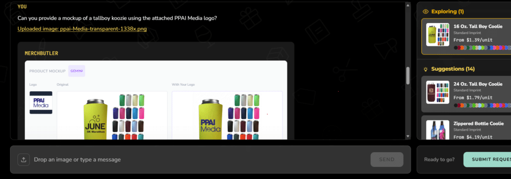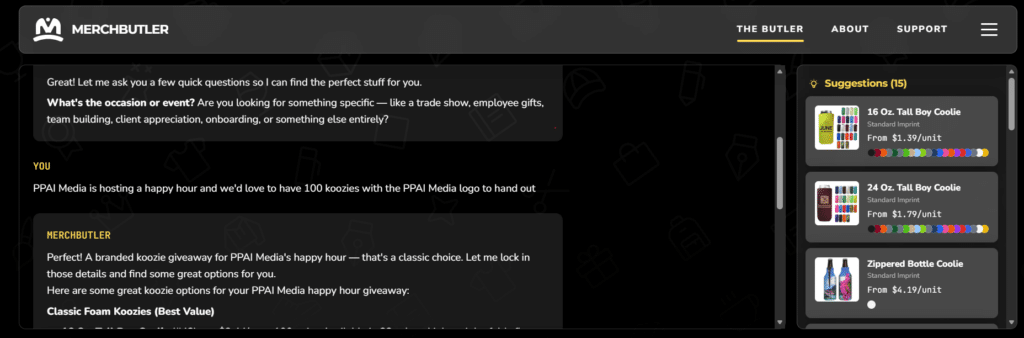 As Simpson ran me through a demo of MerchButler (and later gave me personal access to it), the platform does operate as a literal conversation, meant to circumvent scrolling or browsing. It finds the product with all the specifics including size, logo, font, color and every imaginable detail. It provides mockups. It works within whatever budget provided and provides timetables or works around the client’s timeline.