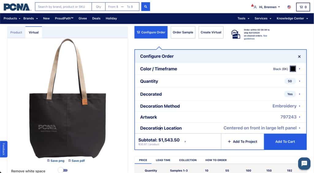 The new design also includes an “order estimate” tool to streamline pricing. It’s so popular it gets more than a thousand uses per week. When distributors configure a decorated order, they also have the option to select previous artwork from their art library or upload new artwork. Once complete, a virtual of the design is rendered for viewing along with the configuration details.