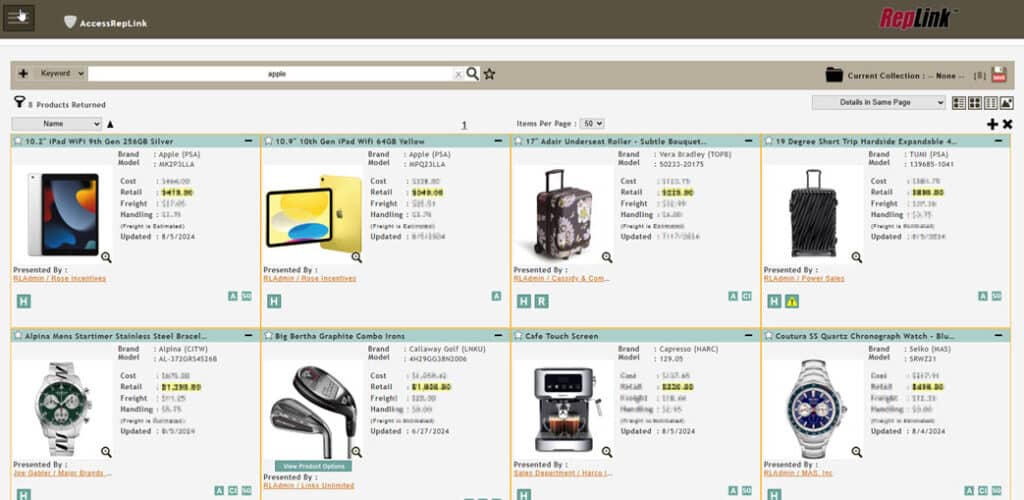 RepLink offers a searchable database of incentive products from more than 2,000 brand name companies. The subscription-based service includes full product descriptions, pricing, freight, hi-res images, product and shipping dimensions, plus more than 200 additional fields of information.